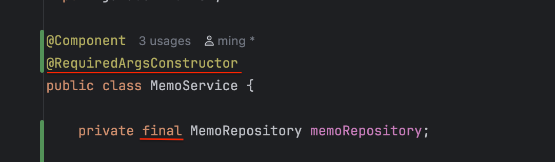 @RequiredArgsConstructor을 사용하면 final이나 @NotNull인 필드를 포함하는 생성자를 생성해주기 때문에 의존 주입이 된다.