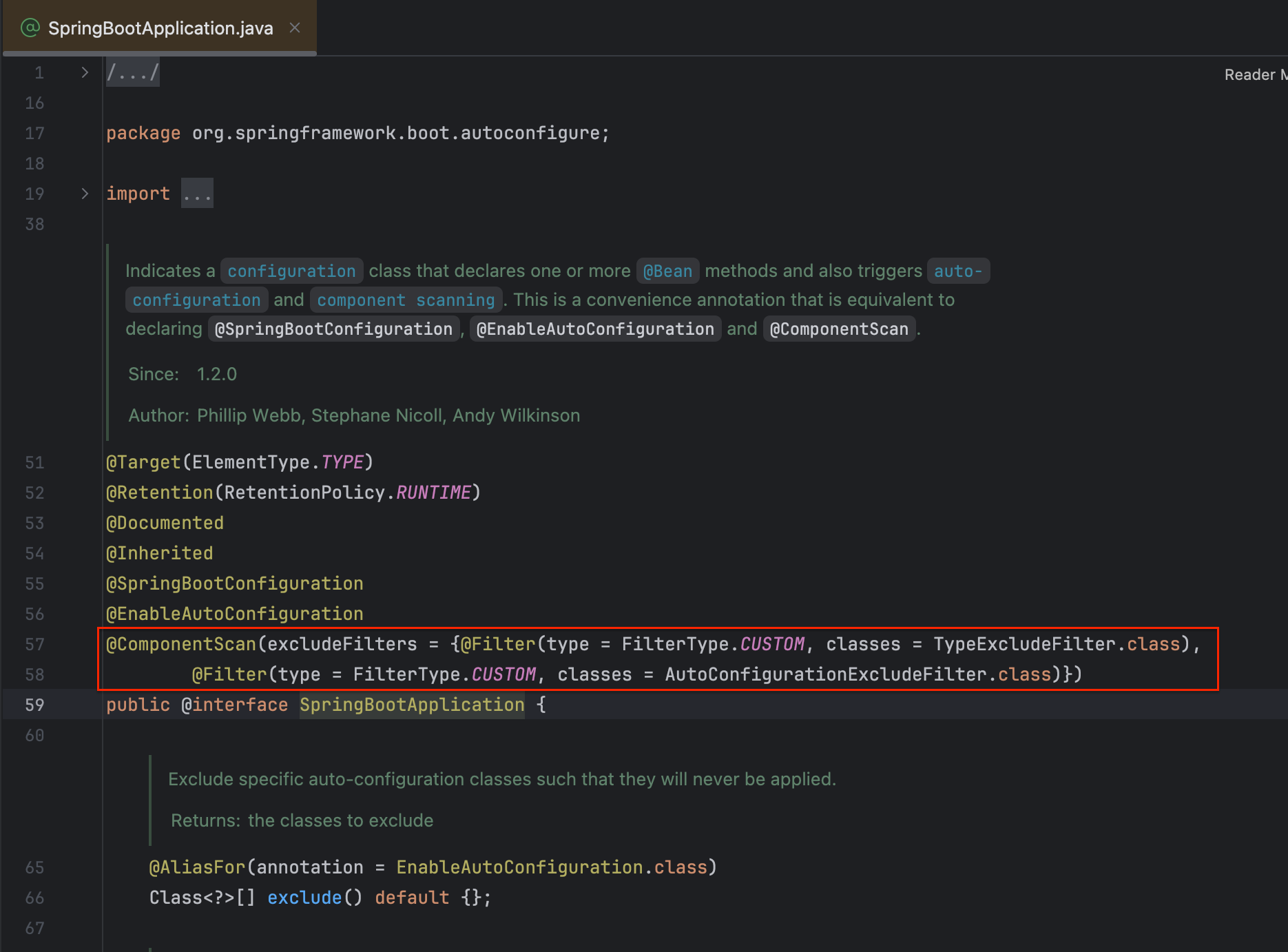 이 어노테이션을 확인해보면 @ComponentScan 어노테이션이 붙어있는 것을 볼 수 있다.