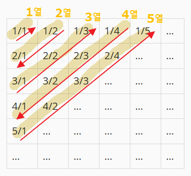 * 4. 각 열이 가진 분수의 개수는 1, 2, 3, 4, 5...로 증가한다.